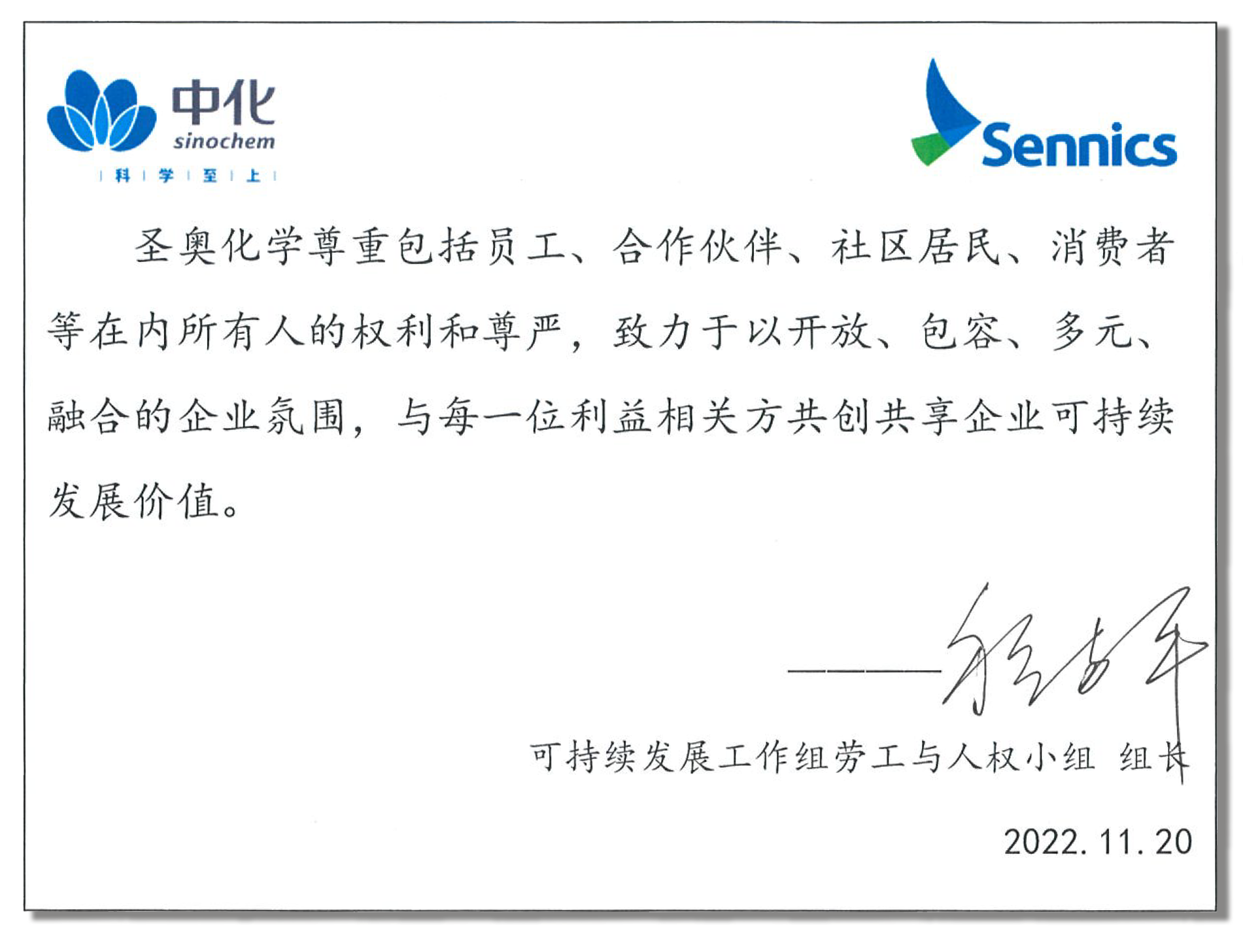 員工是企業(yè)最寶貴的財富。圣奧化學(xué)認(rèn)同《聯(lián)合國世界人權(quán)宣言》《國際勞工組織關(guān)于工作中基本原則和權(quán)利宣言》等國際勞工和人權(quán)標(biāo)準(zhǔn),嚴(yán)格遵守各業(yè)務(wù)所在國(地區(qū))適用的勞動法律法規(guī),擁護(hù)國際勞工組織所提倡的原則,致力于確保全體員工工作條件、福利待遇與國際上普遍接受的勞工標(biāo)準(zhǔn)和社會標(biāo)準(zhǔn)保持一致,由可持續(xù)發(fā)展工作組下勞工與人權(quán)小組負(fù)責(zé)推進(jìn)及落實相關(guān)工作。公司堅決禁止雇傭和使用童工,抵制一切形式的強(qiáng)迫、歧視、騷擾、虐待和強(qiáng)制性勞動;打造安全、健康、平等的職場環(huán)境,暢通職業(yè)發(fā)展通道與意見反饋渠道;尊重合作伙伴及社區(qū)居民的訴求與權(quán)利,持續(xù)為員工、社區(qū)及社會作出積極且可持續(xù)的貢獻(xiàn)。