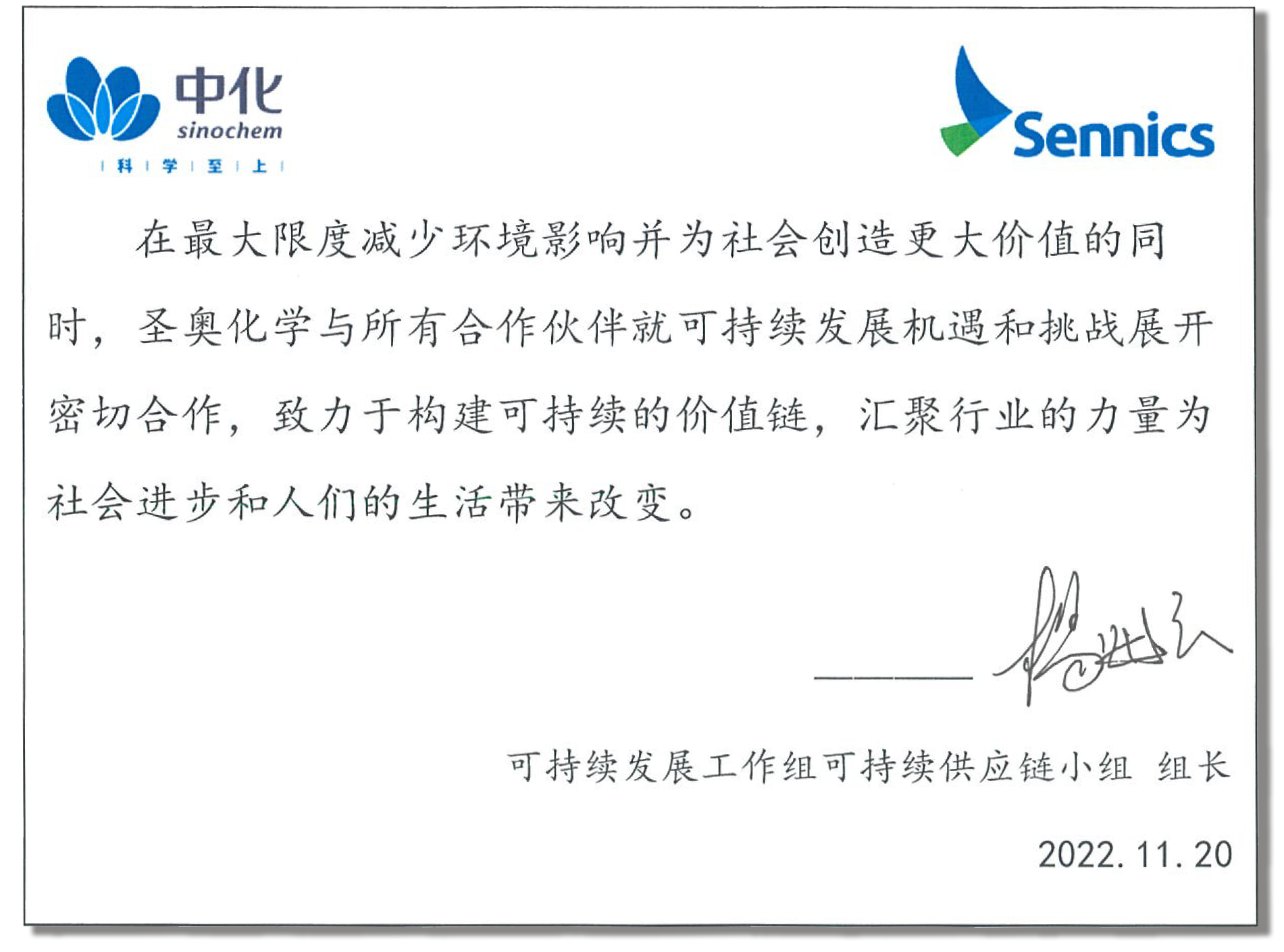 圣奧化學(xué)以推動(dòng)環(huán)境保護(hù)和可持續(xù)發(fā)展為己任,嚴(yán)格要求自己的同時(shí)盡力施展自己的影響,貫徹以“集約管控、智能管理、將采購(gòu)管理重心從事務(wù)性處理向戰(zhàn)略性管理推進(jìn),全面提升可持續(xù)采購(gòu)管理競(jìng)爭(zhēng)力”為中心的可持續(xù)采購(gòu)戰(zhàn)略,在經(jīng)濟(jì)發(fā)展、社會(huì)責(zé)任與環(huán)境保護(hù)等可持續(xù)發(fā)展方面希望供應(yīng)商遵循相同的價(jià)值標(biāo)準(zhǔn),并建立長(zhǎng)期穩(wěn)定、相互信任、互利雙贏的戰(zhàn)略合作關(guān)系,由可持續(xù)發(fā)展工作組下可持續(xù)供應(yīng)鏈小組負(fù)責(zé)推進(jìn)及落實(shí)相關(guān)工作,致力于實(shí)現(xiàn)“踐行綠色采購(gòu),打造具有一流競(jìng)爭(zhēng)力的可持續(xù)供應(yīng)鏈”可持續(xù)采購(gòu)愿景。
