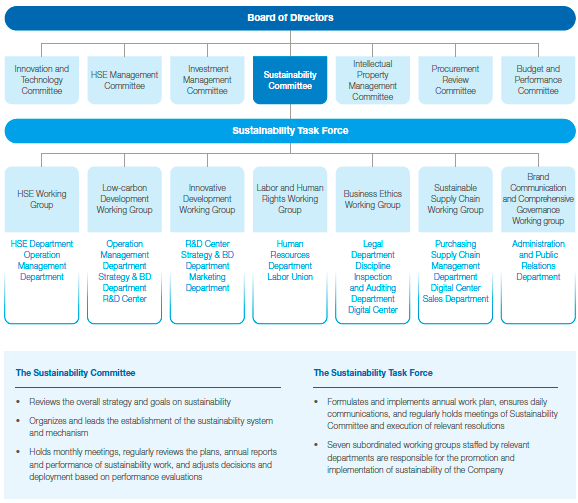 The Sustainability Committee is chaired by CEO, and is comprised of COO and Vice President of Sennics. The Sustainability Task Force led by Vice President of Sennics was established under the Committee, and its members include leaders of relevant departments. There are seven working groups under the Sustainability Task Force, namely Health, Safety, Environmental Protection and Quality (HSEQ), Low-carbon Development, Innovative Development, Labor and Human Rights, Business Ethics, Sustainable Supply Chain, Brand Communication and Comprehensive Governance. They not only carry out responsible for dealing with specific sustainability matters of Sennics, but also review specific issues, sustainable development policies and progress against the related goals every year.