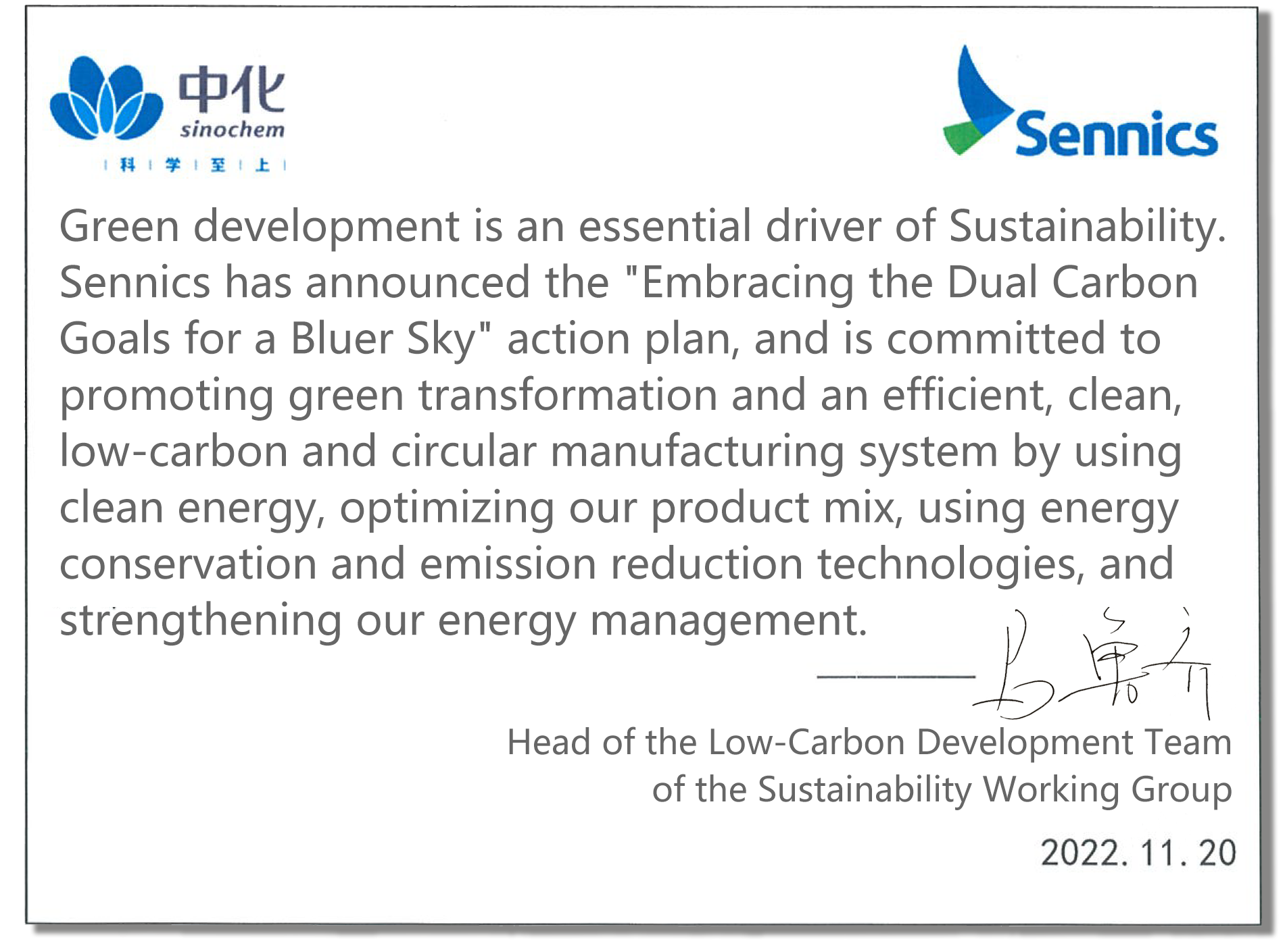 Sennics is committed to "green and ultimate" development by embracing cutting-edge green technologies, promoting the application of energy-saving and low-carbon technologies, and reducing energy consumption and the generation of greenhouse gases (GHGs). We will strive to achieve carbon peak by 2030 and carbon neutrality by 2060, to meet the energy consumption intensity and general control goals, and to continuously reduce GHG emissions through: 1) optimizing our product mix; 2) developing eco-friendly and green technologies; 3) promoting technological transformation and the application of low-energy equipment; 4) coordinating energy use across our parks; 5) striving to achieve operational excellence and create a green supply chain; and 6) promoting energy performance evaluation of new projects.