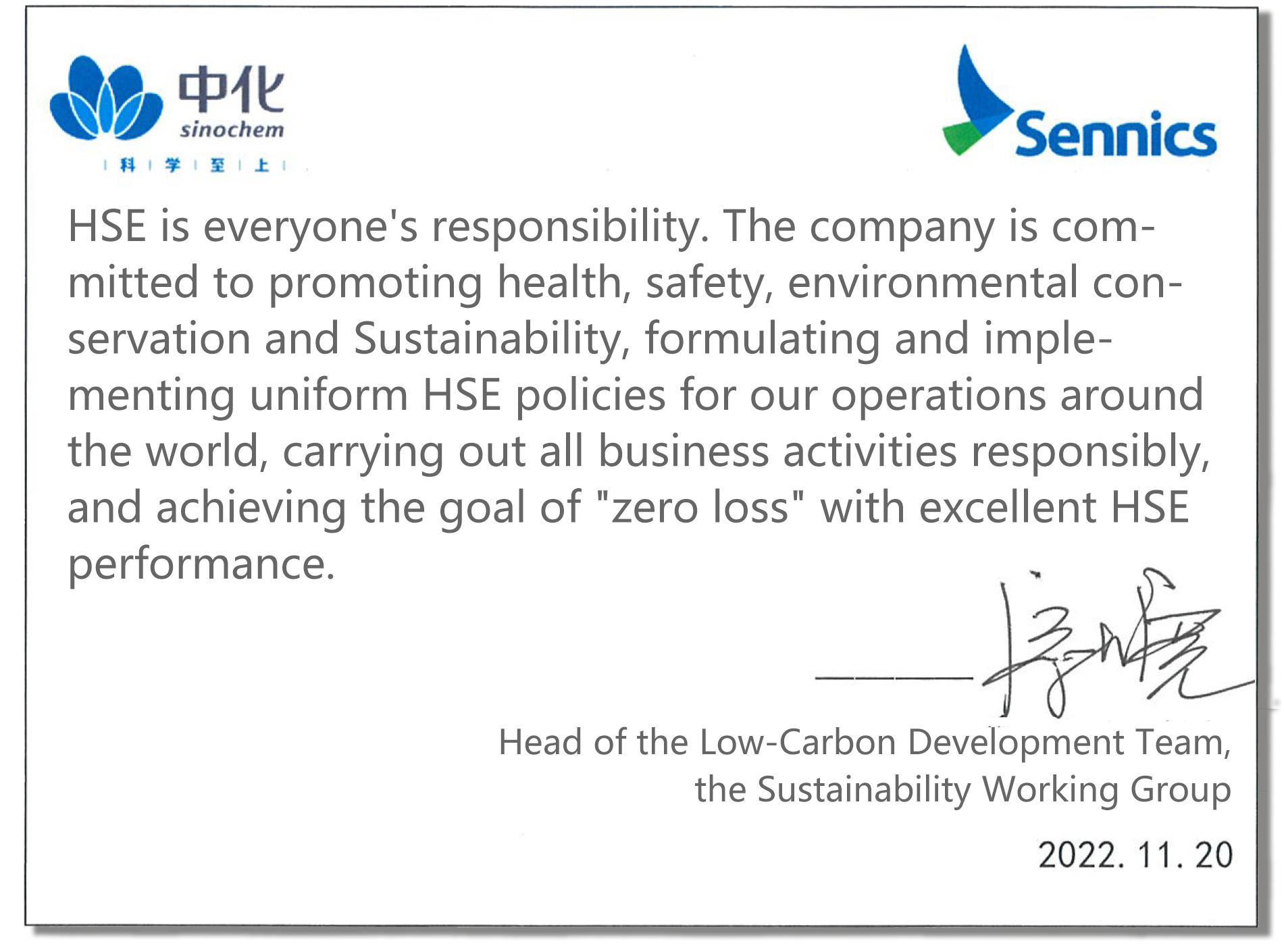 Safe production and environmental protection are not only the lifeline of a chemical enterprise, but also an important basis for the stable and healthy development of the economy and society. Sennics strictly follows national and regional environmental regulations, always regards safety and environmental management as the core elements of production and operation, and continuously improves its essential HSE competitiveness. The QHSE Team, the Low-Carbon Development Team, and the Innovative Development Team under the Sustainability Working Group are responsible for promoting and implementing the relevant work, including: improving the HSE management system and the environmental management system, setting environmental management targets, signing the annual target liability statement, identifying and managing environmental risks and issues on a regular basis, and conducting environment-related KPI assessment, to ensure that the targets are met. Sinochem Holdings' FORUS system is fully implemented at Sennics; all factories under Sennics have been certified to the ISO 14001 Environmental Management System (EMS) standard; and multiple measures have been taken to improve our environmental management continuously. The purpose is to provide a strong support for the company to achieve healthy, safe and green development.