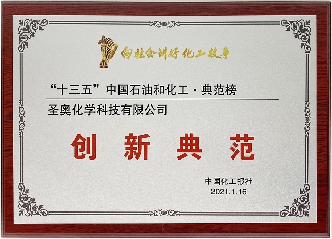 1月16日,“向社會講好化工故事”2020年度中國石油和化工行業(yè)十大新聞暨影響力人物發(fā)布盛典以線上直播方式舉行,會上發(fā)布“十三五”中國石油和化工·典范榜,圣奧化學(xué)上榜“十三五”中國石油和化工典范榜·創(chuàng)新典范。