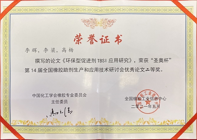 圍繞“創(chuàng)新驅動·美麗化工·服務下游”主題,會議展開論文征集,共收到論文136篇,有115篇論文收入相關論文集。圣奧化學共有三篇論文《環(huán)保型促進劑TBSI應用研究》《綠色防老劑STMQ在輪胎中的應用》《不同老化條件對防老劑6PPD性能的影響》入選。經與會代表投票和專家評審委員會審議,評選出10篇優(yōu)秀論文,圣奧化學《環(huán)保型促進劑TBSI應用研究》榮獲“圣奧杯”優(yōu)秀論文二等獎。