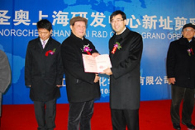 (2010年1月11日,上海)全球最大的橡膠防老化劑供應(yīng)商江蘇圣奧化學(xué)科技有限公司(以下簡稱“江蘇圣奧”)上海研發(fā)中心今日在上海張江高科技園區(qū)正式擴建落成,這標志著江蘇圣奧自主研發(fā)全面進入快速發(fā)展時期。南京工業(yè)大學(xué)校長、中國工程院院士歐陽平凱、中國化工協(xié)會精細化工委員會主任委員王大全等嘉賓均到場表示祝賀。江蘇圣奧首席營運官兼首席財務(wù)官蔡崢琦攜公司其他高層也一道出席了本次典禮,并向南京工業(yè)大學(xué)校長歐陽平凱院士和中國化工協(xié)會精細化工委員會主任委員王大全頒發(fā)聘書,正式邀請其擔(dān)任技術(shù)顧問,以進一步增強江蘇圣奧產(chǎn)學(xué)研一體的研發(fā)系統(tǒng)實力。