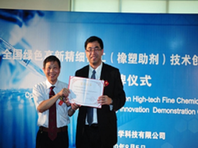 中國工程院院士李俊賢、中國化工學(xué)會(huì)精細(xì)化工專業(yè)委員會(huì)主任王大全、泰州市相關(guān)政府部門領(lǐng)導(dǎo)等嘉賓均出席了此次的掛牌儀式。在儀式上,王大全主任向江蘇圣奧首席執(zhí)行官兼首席財(cái)務(wù)官蔡崢琦頒發(fā)證書,正式授予江蘇圣奧 “全國綠色高新精細(xì)化工(橡塑助劑)技術(shù)創(chuàng)新示范中心”的稱號(hào)。