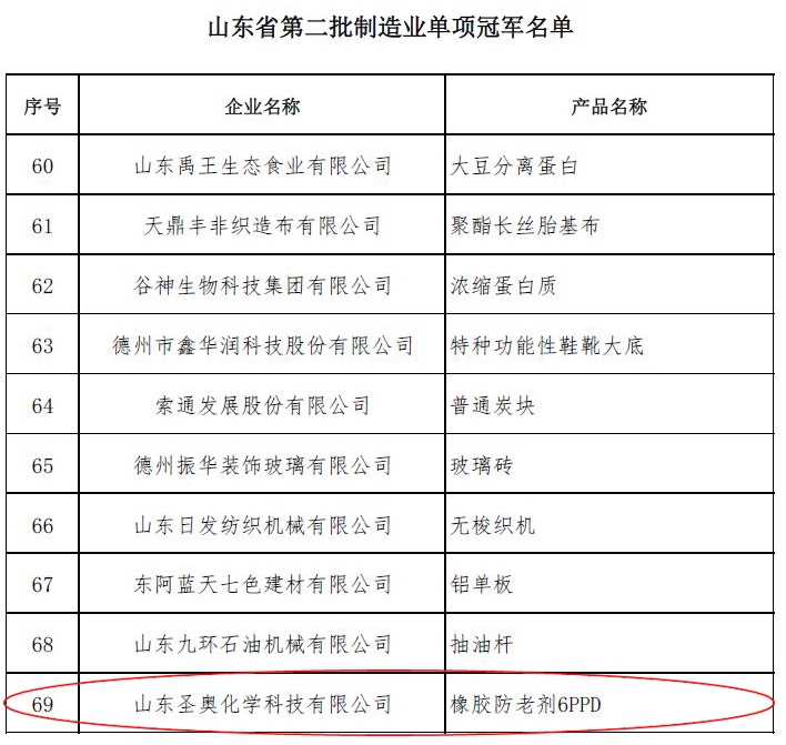 近日,山東省工業(yè)和信息化廳公布了山東省第二批制造業(yè)單項冠軍企業(yè)名單,全省共69家企業(yè)入圍,山東圣奧憑借產(chǎn)品橡膠防老劑6PPD成功上榜。