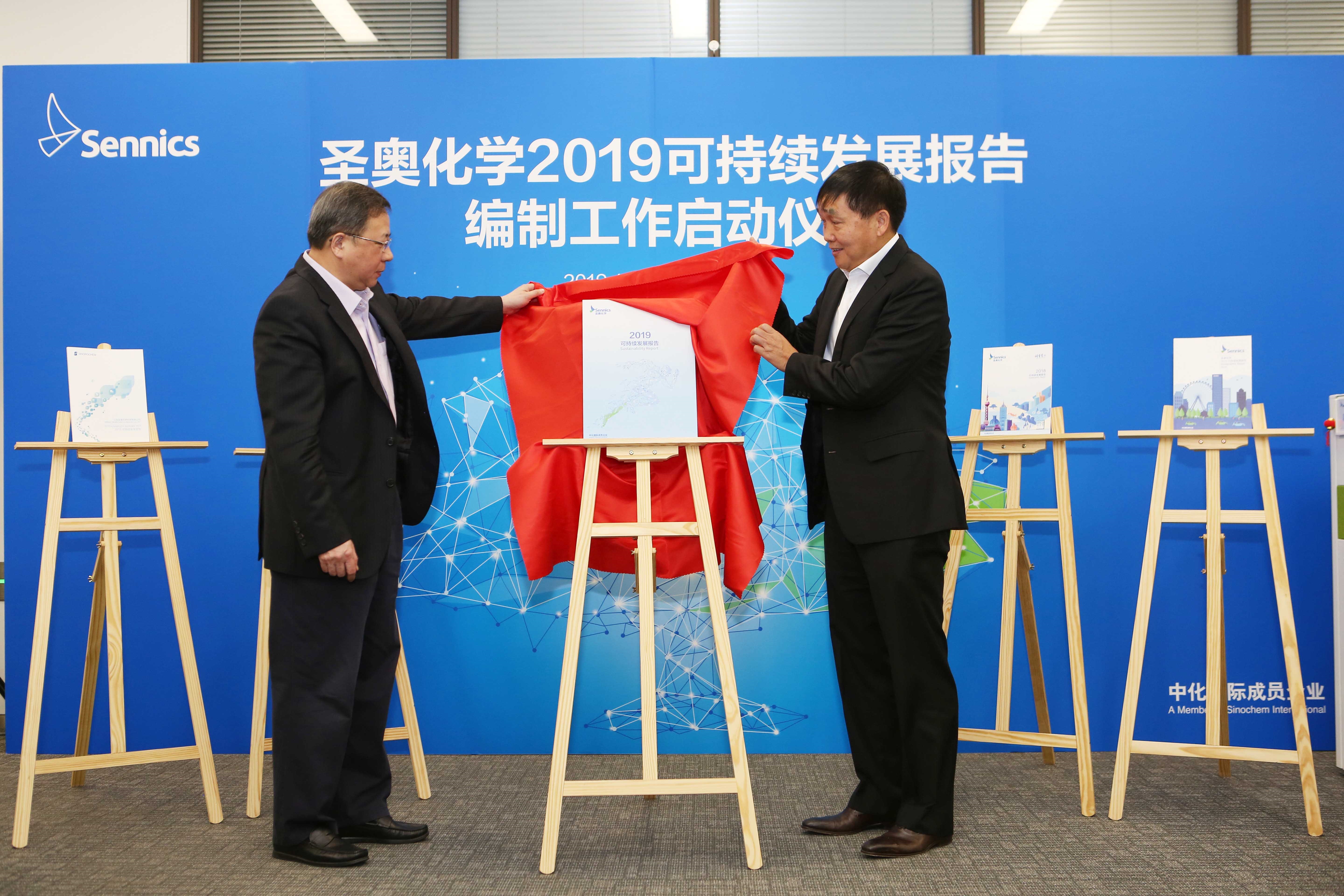 調(diào)研期間,楊華和劉紅生一起,共同為2019年圣奧化學(xué)可持續(xù)發(fā)展報告編制工作啟動儀式揭牌。