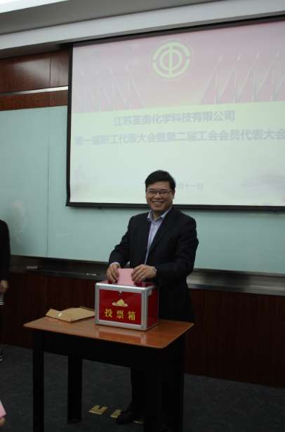 2016年4月11日,江蘇圣奧化學(xué)科技有限公司成功召開了第一屆職工代表大會(huì)暨第二屆工會(huì)會(huì)員代表大會(huì)。來自上海運(yùn)營(yíng)總部、曹縣、泰安、銅陵工廠以及泰州辦事處的40名職工代表,以及江蘇圣奧總監(jiān)級(jí)別以上人員和各子公司總經(jīng)理、工會(huì)主席、負(fù)責(zé)企業(yè)文化建設(shè)工作同志共60余人參加了會(huì)議。