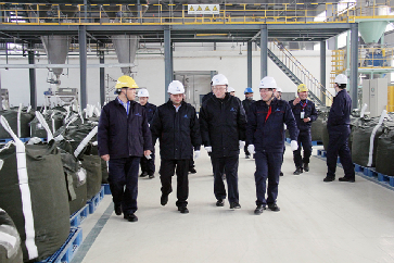 江蘇圣奧董事長覃衡德首先實(shí)地檢查了山東圣奧生產(chǎn)基地的主要生產(chǎn)區(qū)、DCS主控室等,重點(diǎn)查看了生產(chǎn)區(qū)域內(nèi)的安全消防管理、綠色環(huán)保工作,并對新項目不溶性硫磺車間作了深入調(diào)研,詳細(xì)了解了不溶性硫磺車間的生產(chǎn)現(xiàn)狀、安全設(shè)施建設(shè)、裝置改造運(yùn)行和產(chǎn)品質(zhì)量等。