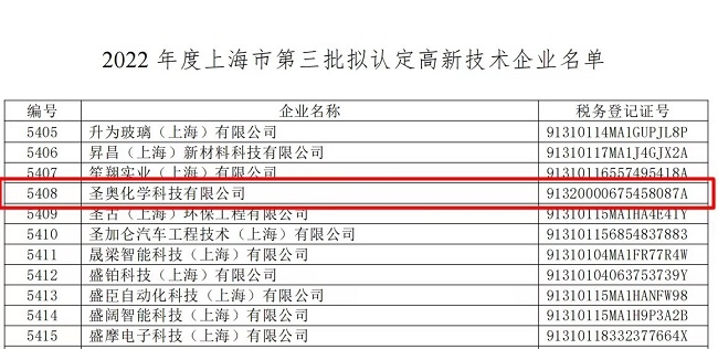 日前,上海市高新技術(shù)企業(yè)認(rèn)定指導(dǎo)小組根據(jù)科技部、財(cái)政部、國(guó)家稅務(wù)總局《高新技術(shù)企業(yè)認(rèn)定管理辦法》《高新技術(shù)企業(yè)認(rèn)定管理工作指引》及《上海市高新技術(shù)企業(yè)認(rèn)定管理實(shí)施辦法》的有關(guān)規(guī)定,發(fā)布《2022年度上海市第三批符合認(rèn)定條件擬認(rèn)定高新技術(shù)企業(yè)名單》,圣奧化學(xué)通過(guò)層層申報(bào)和審核脫穎而出,榮獲“高新技術(shù)企業(yè)”稱(chēng)號(hào)。