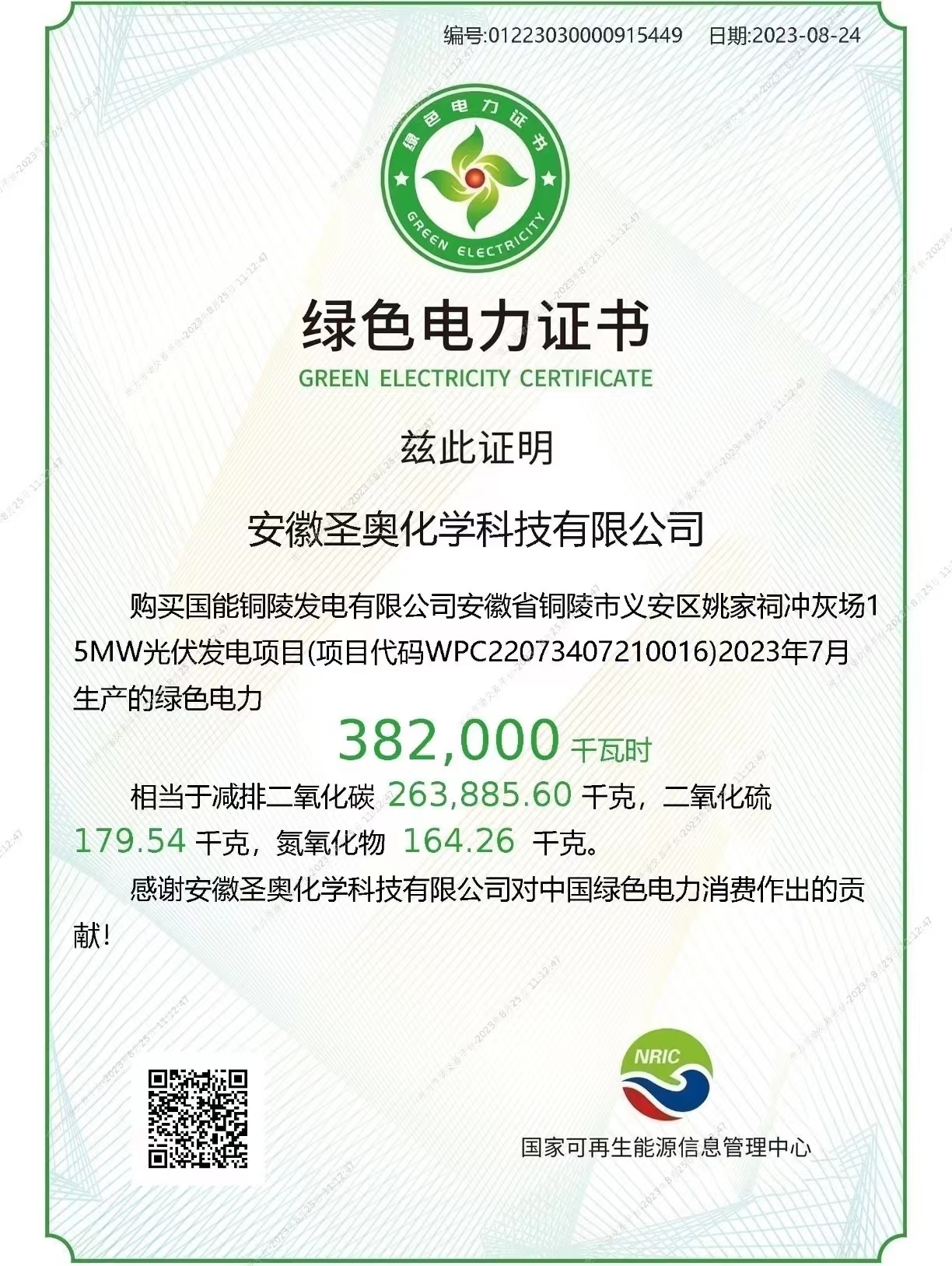 日前,安徽圣奧獲得國家可再生能源信息管理中心核發(fā)的綠色電力證書(簡稱“綠證”),成為安徽省首批使用綠電企業(yè),標志著安徽圣奧在助力“雙碳”目標達成和綠色可持續(xù)發(fā)展工作中再添新動力。