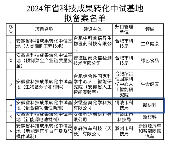 近日,安徽省科技廳發(fā)布《2024年安徽省科技成果轉(zhuǎn)化中試基地擬備案名單》,安徽圣奧獲批“安徽省科技成果轉(zhuǎn)化中試基地(聚合物功能性助劑)”資質(zhì)。
