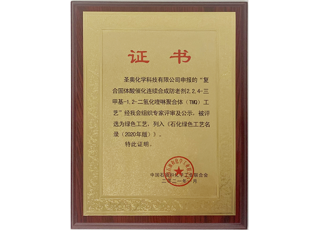 In order to promote the application of advanced green process technology in the petroleum and chemical industry and enable the List of Green Processes in the Petrochemical Industry to play a bigger role in guiding the green development of the industry, the List of Green Processes in the Petrochemical Industry (2020 Version) compiled by CPCIF was released in Beijing on January 15. Sennics' process of continuously synthesizing 2,2,4-trimethyl-1,2-dihydroquinoline polymer (TMQ) with composite solid acid as catalyst was also included.