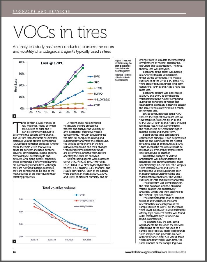 At the same time, a series of excellent speeches, forums and seminars were held at the exposition, involving the topics of tire design, tire manufacturing technology, tire performance development and progress. Sennics delivered a keynote speech titled "Volatile Substances of Antioxidants and Tire Odor", introducing the odor sources of automobile tires and the control measures for the main volatile substances produced in the process of tire compound processing. It demonstrated the company's innovation and R&D capabilities, and showed its firm determination to take the road of green operation, environmental protection and sustainable development, which received wide attention and praise from customers. VOCs in Tires is also included in the English magazine of the exhibition called 2018 Tire Technology International.