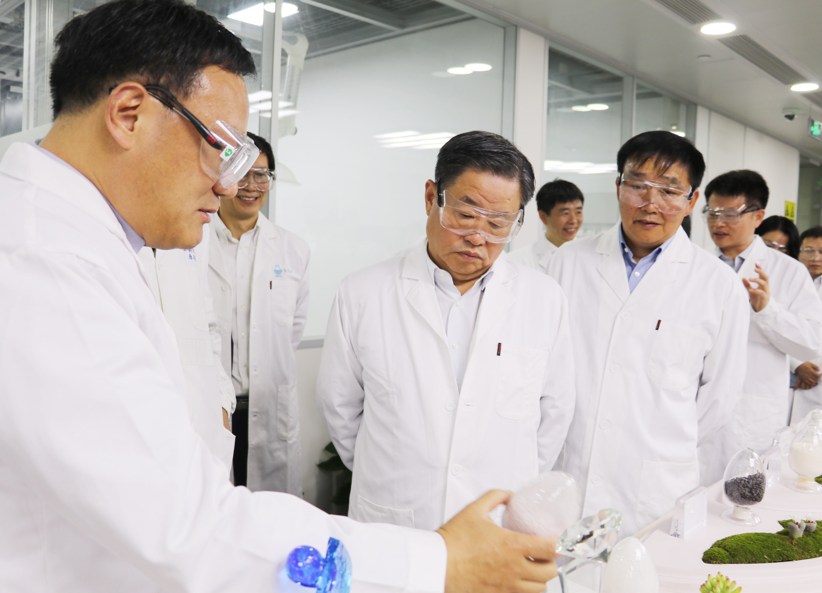 During the inspection, Mr. Ning took a tour of the R&D center's lab, and listened to the detailed report about the ongoing innovation of antioxidants, about the construction of the eco-friendly accelerant production project at the Sinochem Lianyungang Industrial Park, and about the progress of the plastic additives project. He also talked with the front-line researchers, to get detailed information about their actual needs.